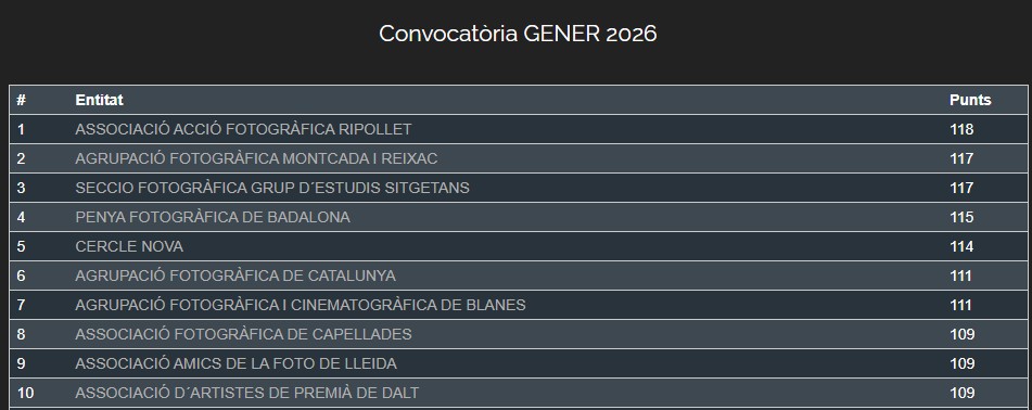 Cinquena convocatòria Gener 2024 a la 15a Lliga Catalana de Fotografia dels participants de l’Agrupació Fotogràfica de Capellades. Gràcies a tots per participar!!!