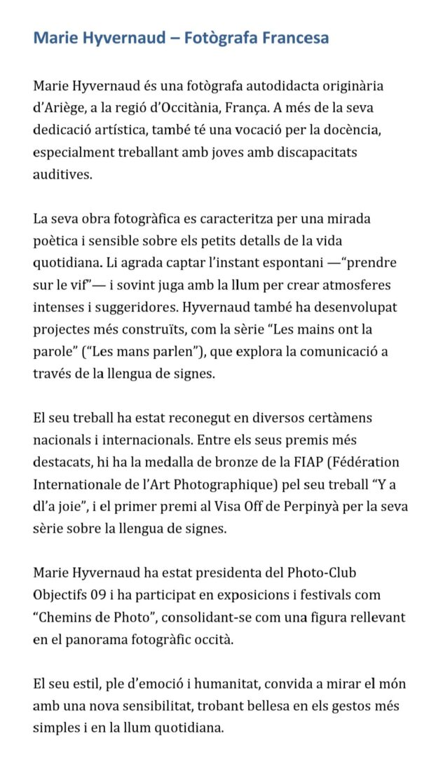 La sessió va girar entorn de l’obra de la fotògrafa francesa Marie Hyvernaud i la seva exposició Ressonància. Es va parlar de la història que s’amaga darrere de les imatges, de les dualitats que proposa i del camí que l’ha portat a construir aquest univers tan particular.